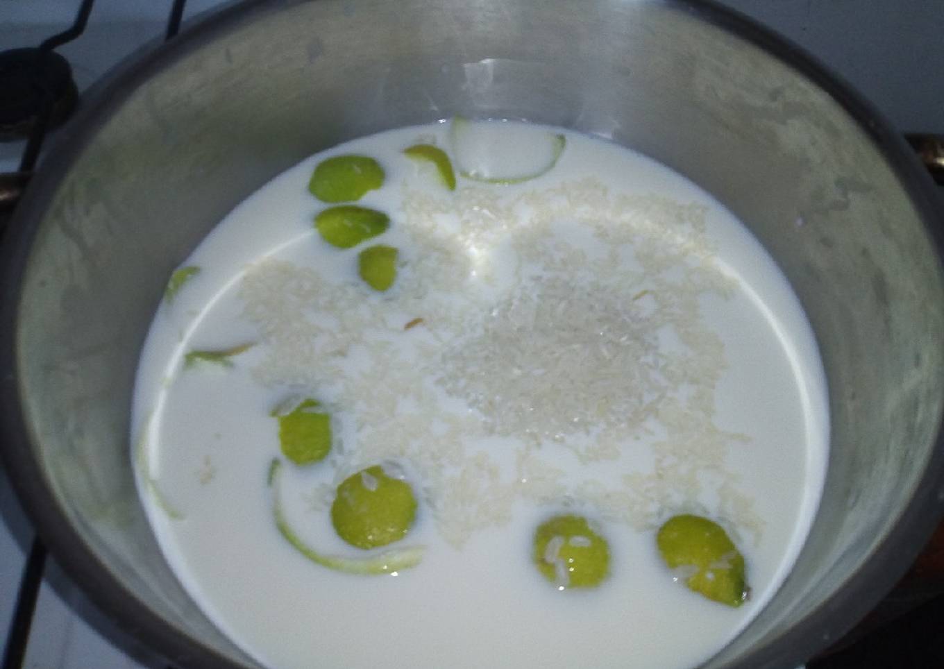 - La leche, el arroz, el azúcar, la esencia y la cáscara del limón en una olla