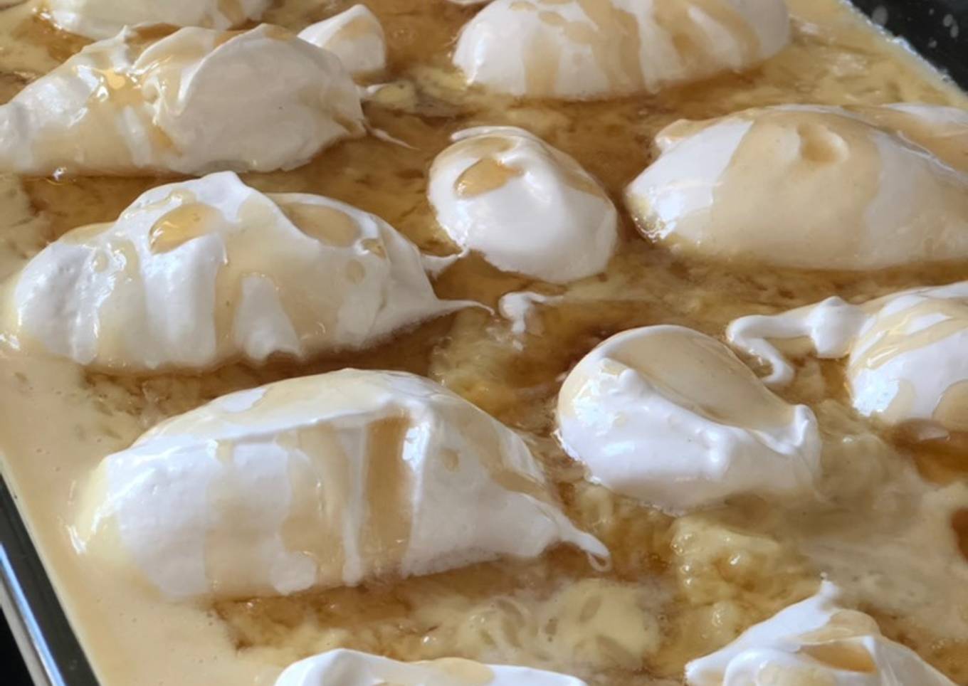 - Agrega la preparación de arroz con leche y el merengue en el formato que más te guste. Chorrea un poco de caramelo encima de todo esto