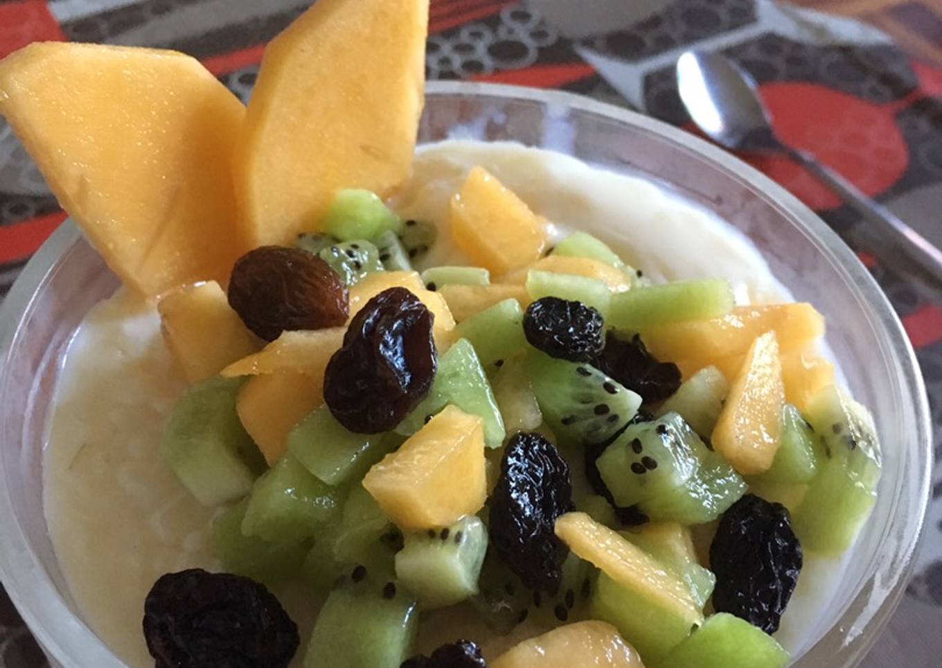 - Servir en copas o boles y adornar con las frutas en trozos kiwi y kaki