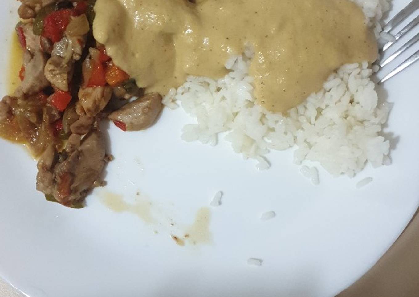 Arroz con pollo con salsa de curry, mango y leche de coco
