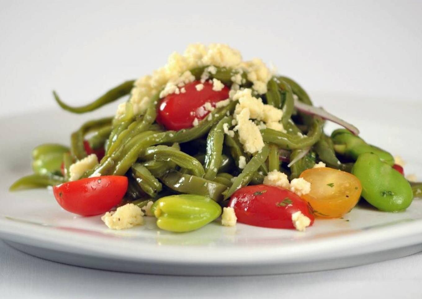 Steps to make to make Ensalada de nopales, habas y tomates con queso fresco.