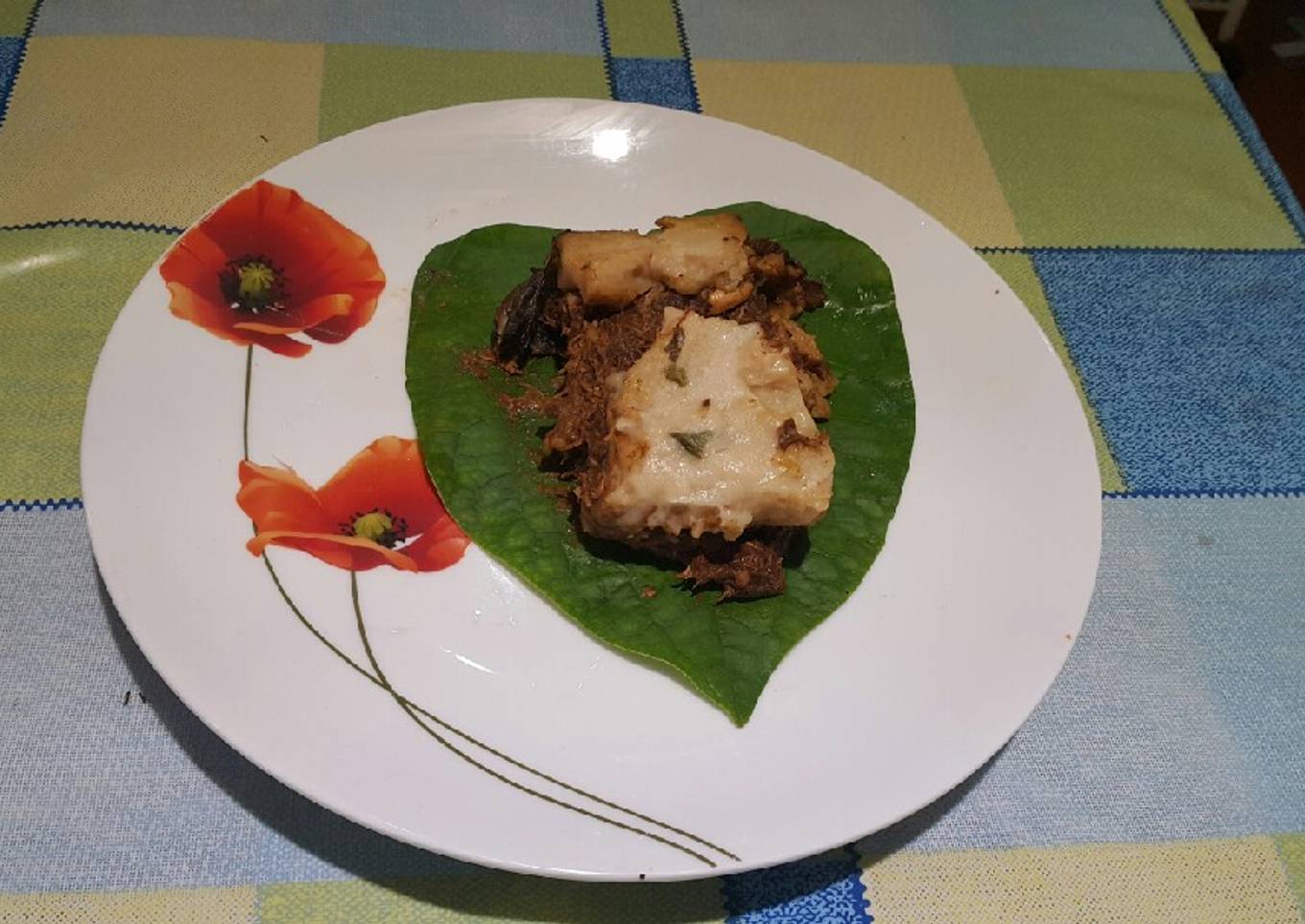 - En un molde refractario se cubre el fondo con hojas de tlanepa, se pone la mitad de la masa, luego el mole preparado y encima la otra mitad de la masa, se cubre totalmente con hojas de tlanepa.