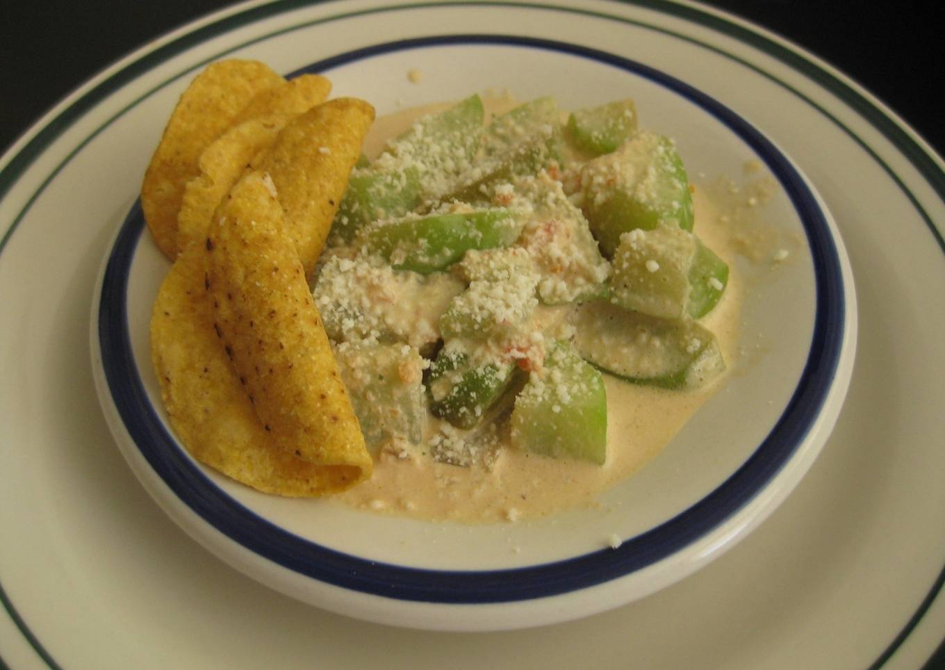 Chayotes fritos con cebolla, tomates y ajitos, se agrega la media crema para suavizar.
