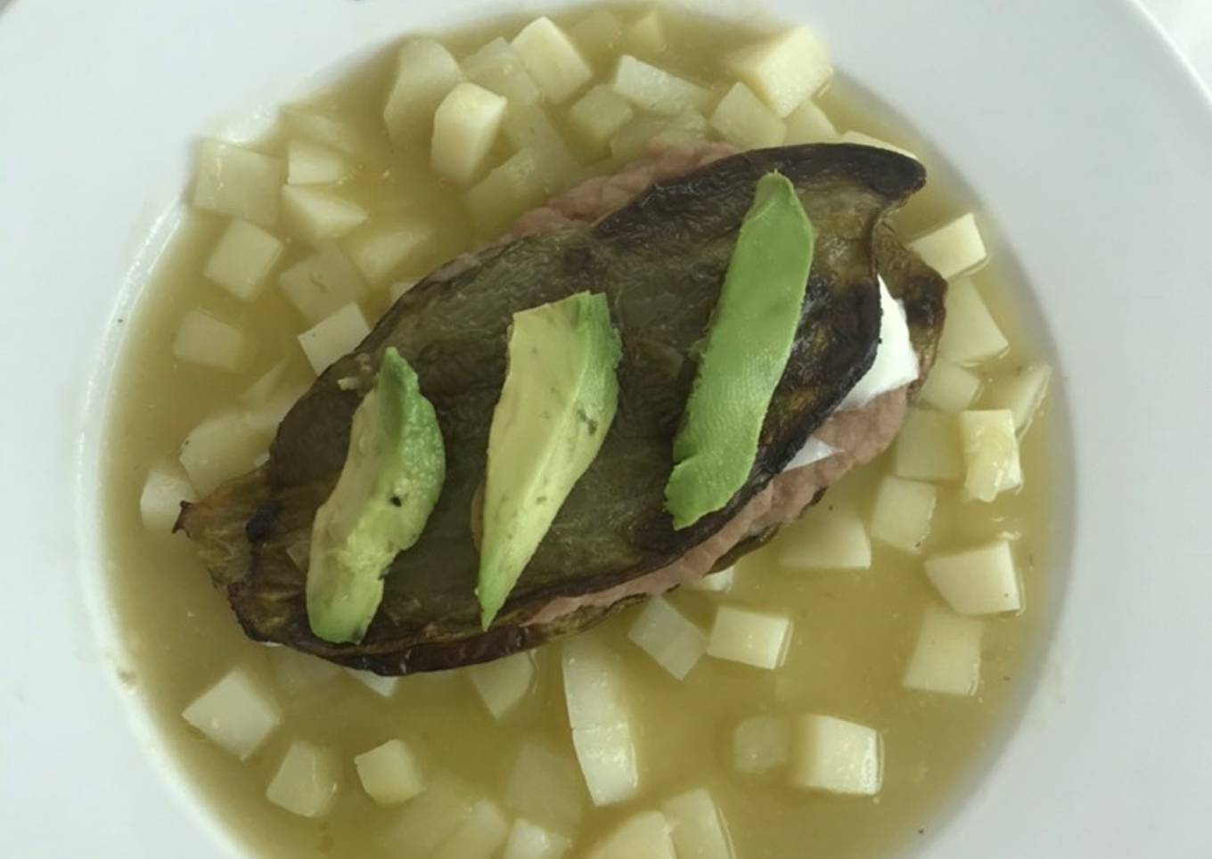 - Preparación Platillo: En un plato se pone una capa de chayote con papá en salsa verde y se coloca encima el nopal con los frijoles con queso Panela. Antes de colocar el nopal calentar.