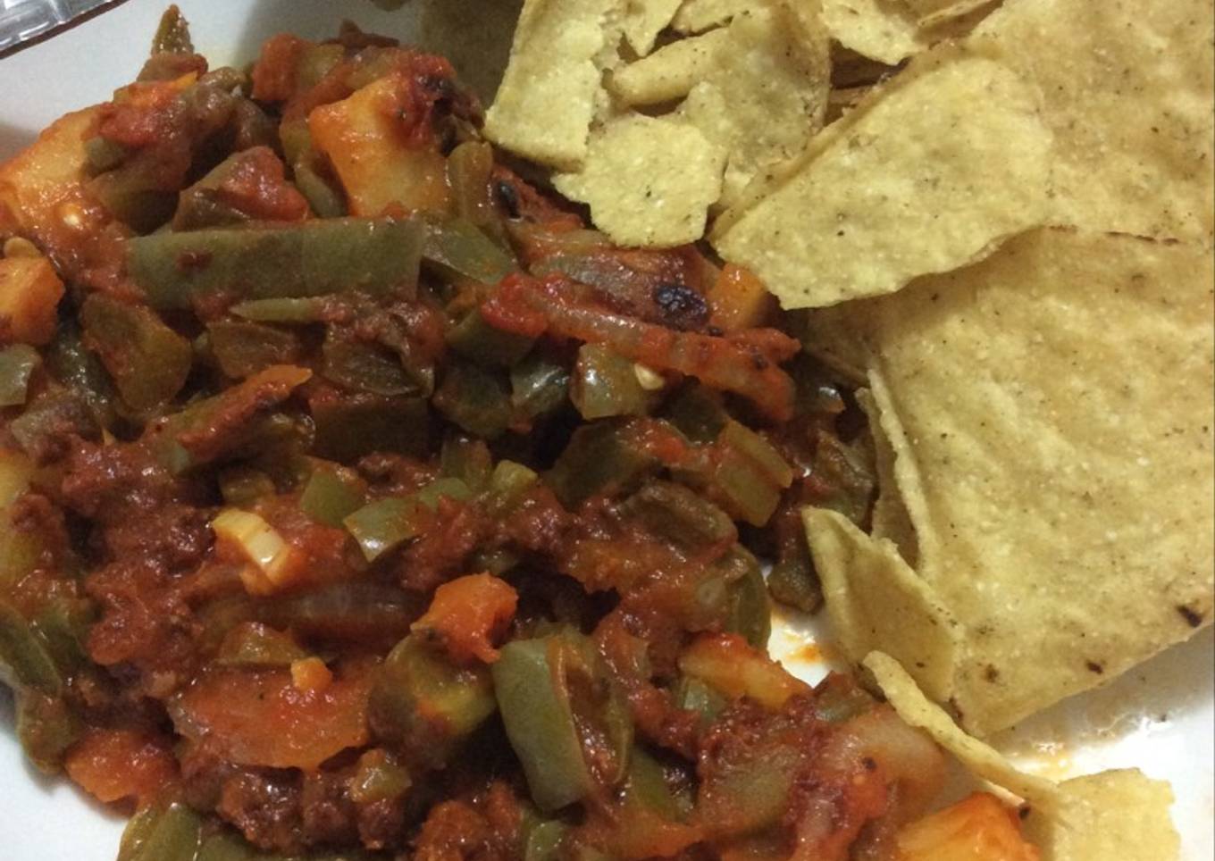- Colocarle el nopal previamente cocido y lavado y la longaniza previamente sofrita. Yo le agregue papa cocida en trozos pequeños y lo acompañe con arroz blanco y totopos.