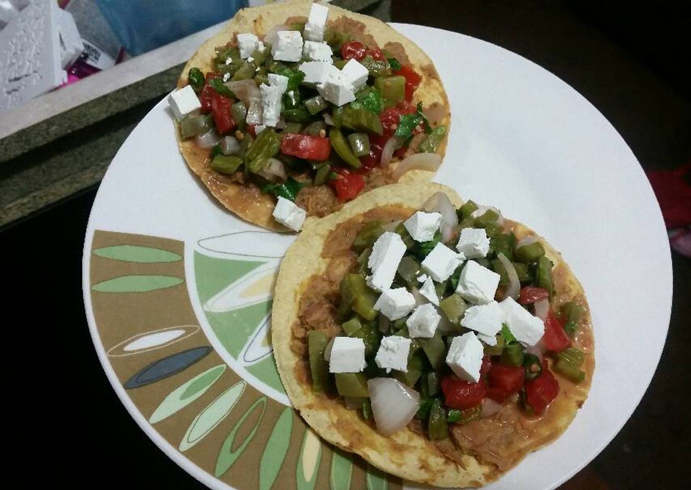 - Procedemos a preparar las tostadas, untamos los frijoles (yo decidí usar frijoles refritos con chorizo) encima colocamos la mezcla de nopales, encima agregamos el queso desmoronado. Y listo para comer.