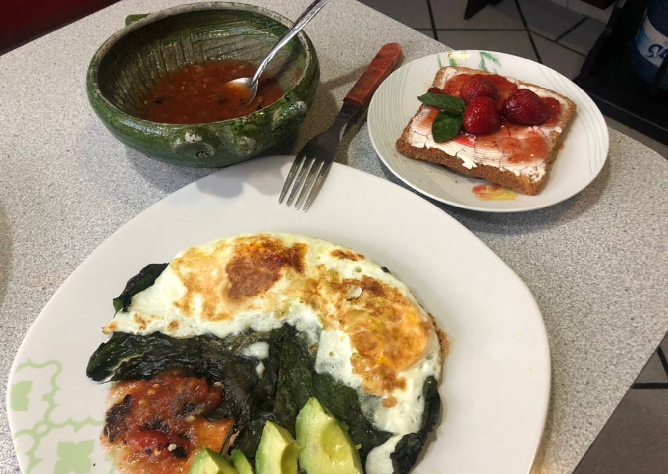 - En el sartén caliente con unas gotas de aceite, coloca las hojas santas, después coloca el huevo, deja cocer, agrega sal al gusto y listo ya está el desayuno, acompaña de una salsa de tomate, aguacate y frijoles.